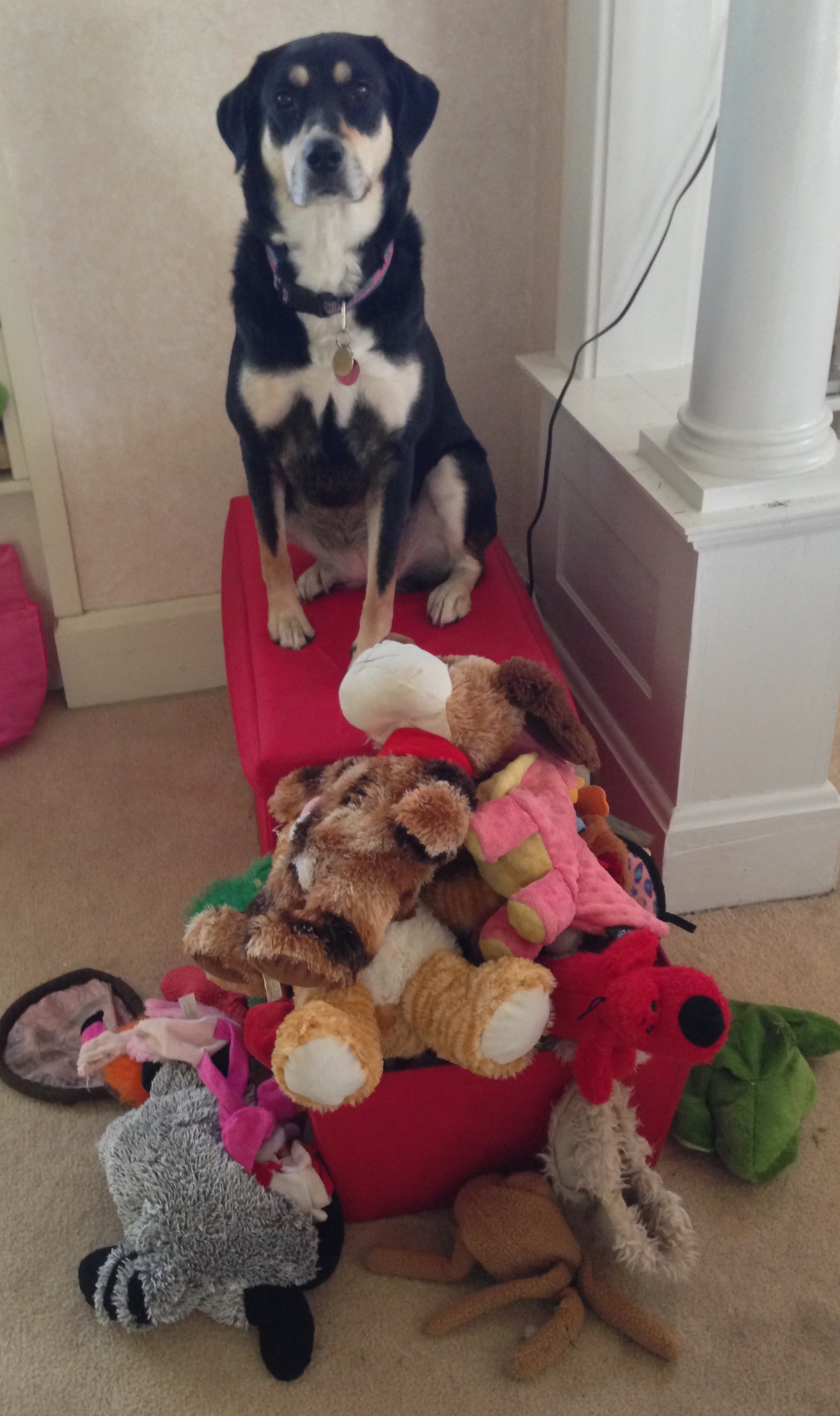 Choppy sitting on her box of toys that are currently out of rotation. These are her downstairs toys; she also has a bin of toys upstairs (you know, in case she needs something to play with when she is upstairs, and can’t be bothered to go downstairs to find a toy. In related news, this is yet another reason Choppy is not the skinniest dog ever).