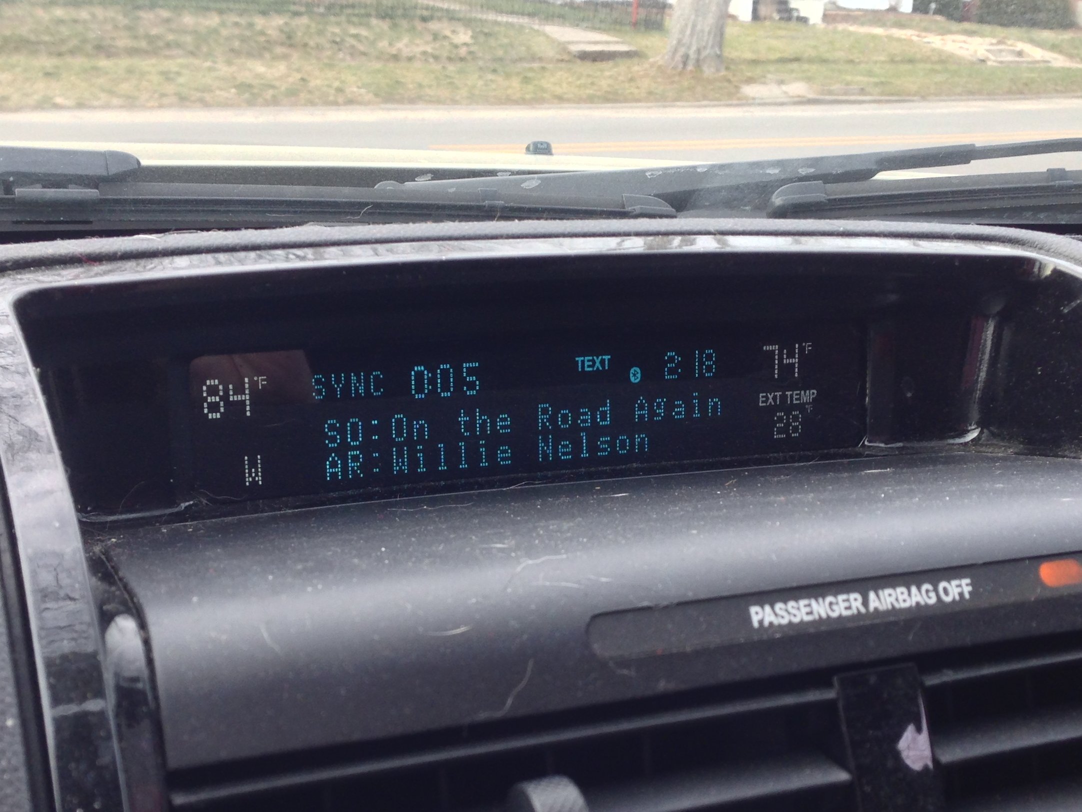 A little further down the road (‘little’ being the operative word there, as I took this at the end of my block while sitting at a stop sign). Starting the trip off right, with a little Willie Nelson – just as every car trip I can remember has started (even when it was my dad singing the song, rather than the iPod playing it).