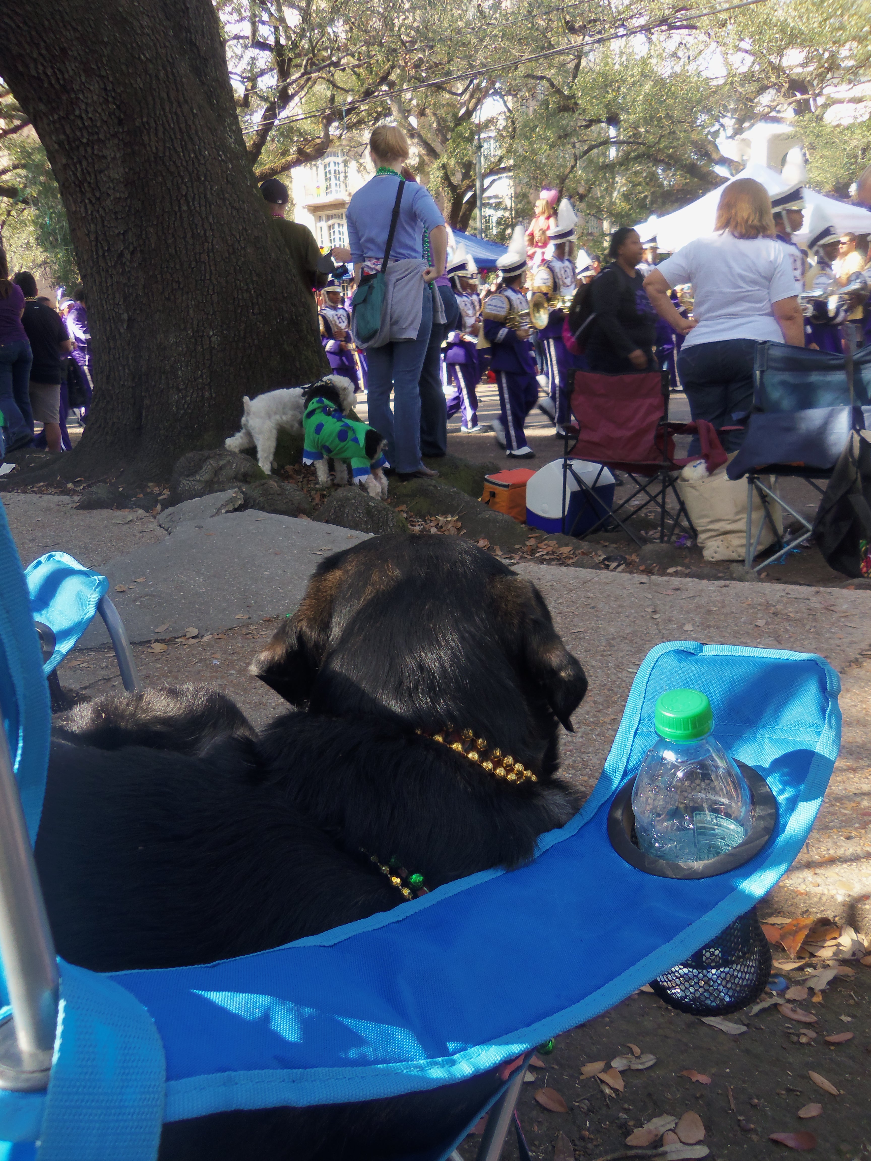 Now, technically, dogs are not supposed to be on the parade route. This is a rule that, at least in my experience, is regularly flaunted (it’s definitely not the only rule regularly flaunted when it comes to Mardi Gras). There are dogs all over the parade route – hanging on the neutral ground, walking the route between parades, and just generally enjoying the party atmosphere.