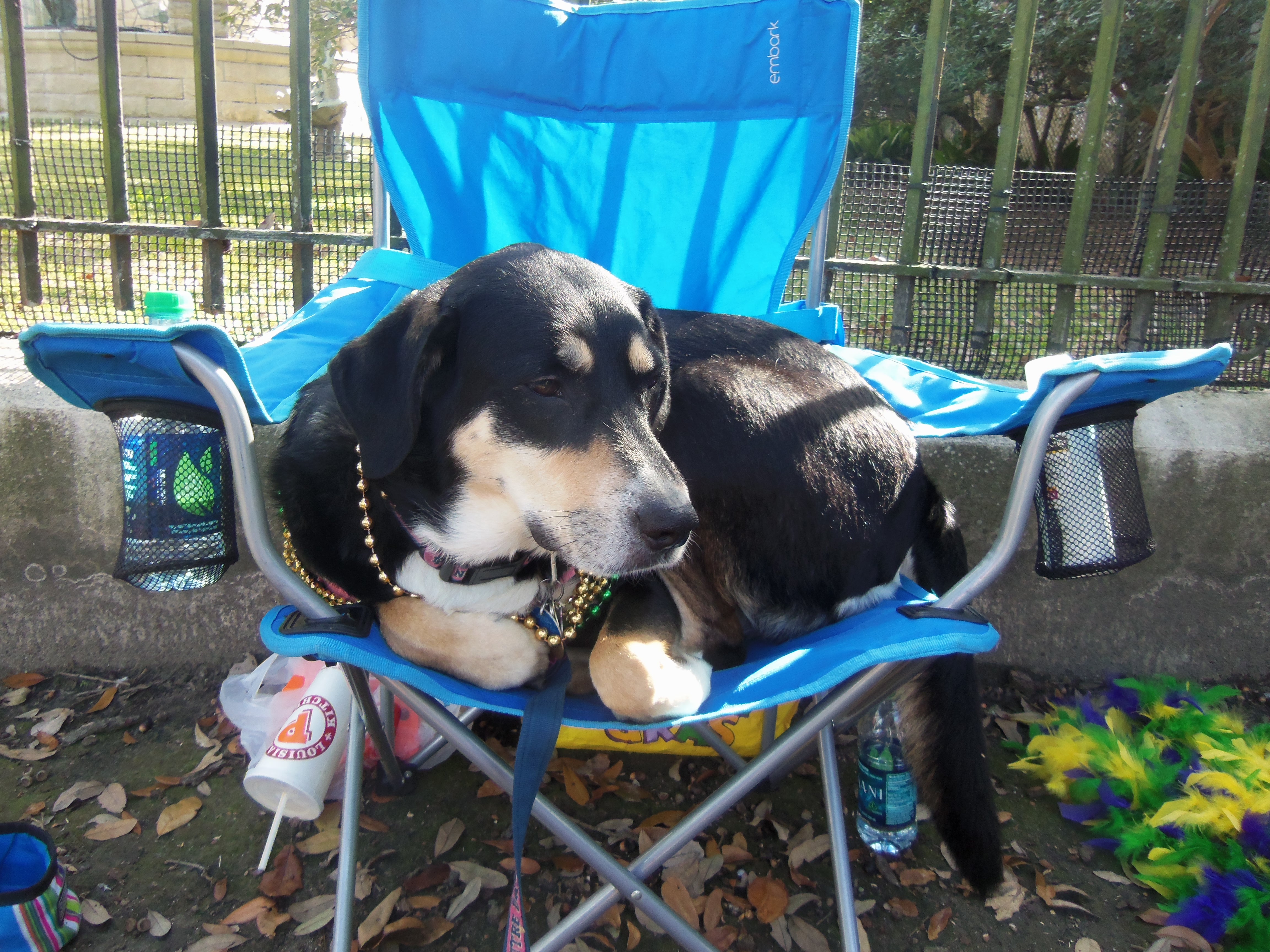 Choppy was a trooper throughout the day. The parades are really, really loud: there are bands, piped in music, tractors, motorcycles, snap & pops, and any number of other things that make noise, both as part of the parades, and as made by people watching the parades. The parades can be a sensory overload for a person; I can only imagine how it is for a dog. Between the giant floats, the horses, the bands, and the crowds, it has to be scary. But Choppy just chilled at the back of the crowd, occasionally hit by some beads, and just gamely taking the whole thing in. I hope she maintains this level of chill throughout the trip.