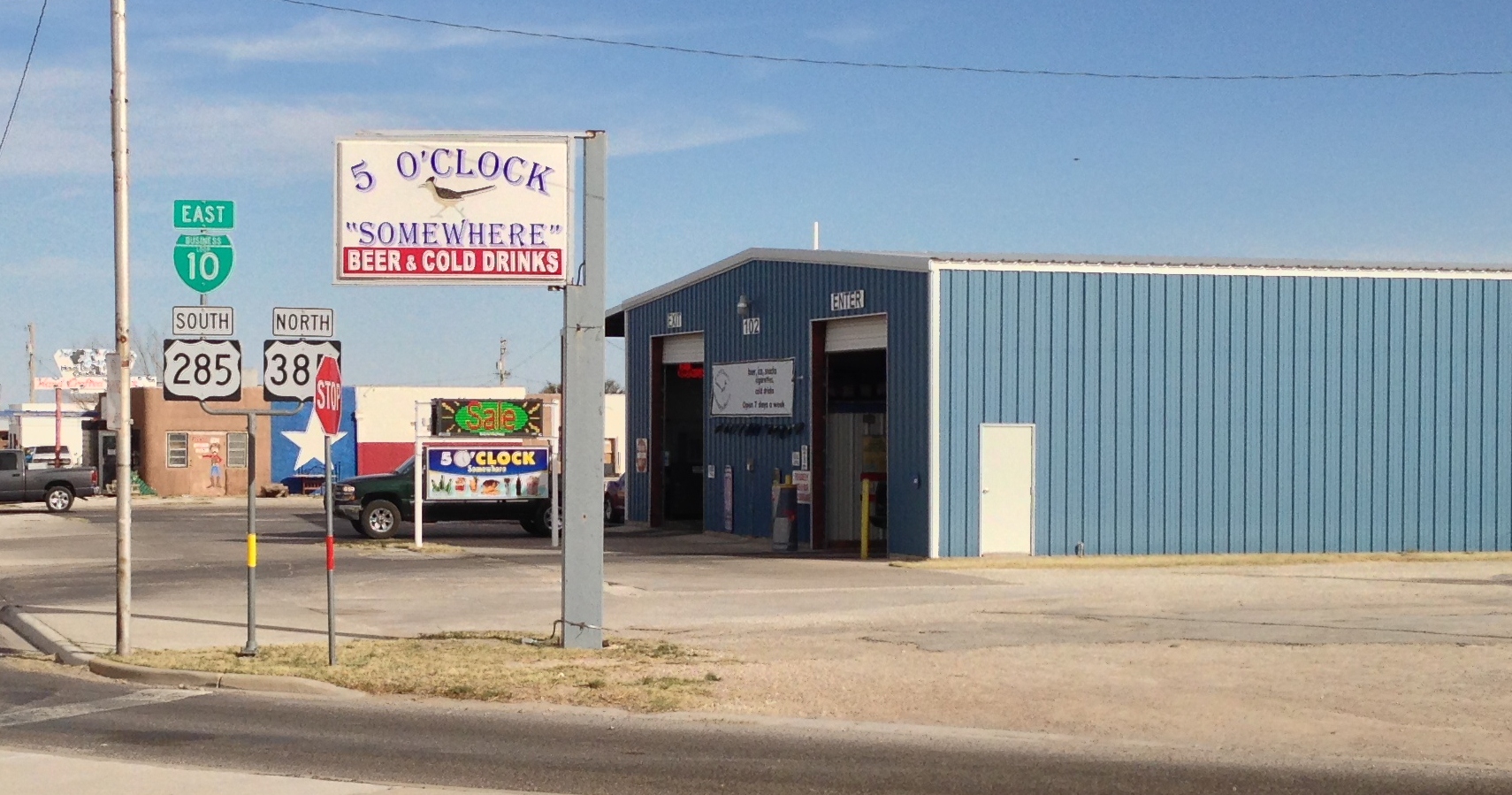 This is the 5 O’Clock Somewhere Drive-Thru Liquor Store. Note the picture of Paisano Pete on the sign. It’s right across from him. If ever you visit Fort Stockton, you can take a picture with Paisano Pete and get drinks within mere seconds. I approve of everything about this.