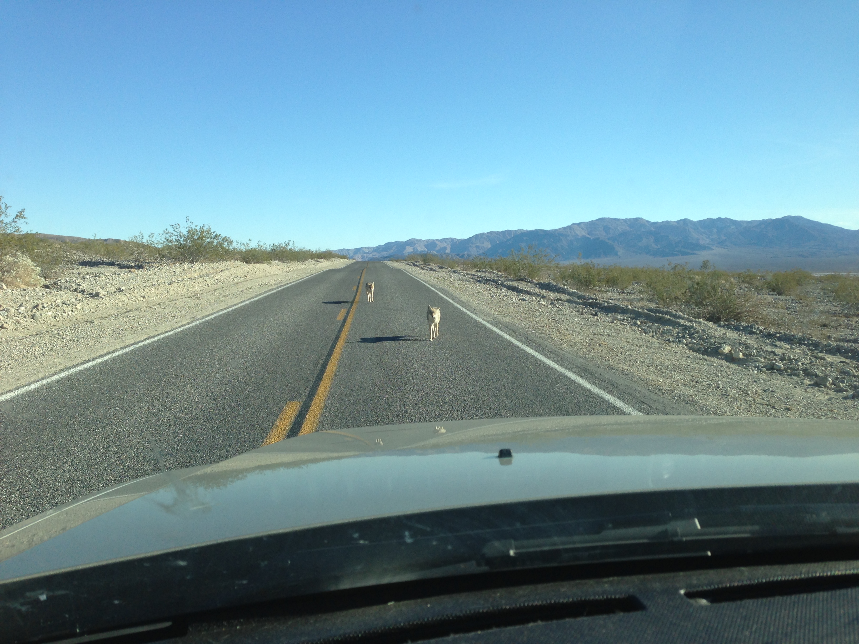 Turns out? Not dogs. Coyotes. The boldest three coyotes I have ever seen. Like the ravens at the Grand Canyon, these guys seemed like they wanted to be fed. And, again, I didn’t feed them. Though Choppy did bark up a storm at them, which did not faze them in the least.
