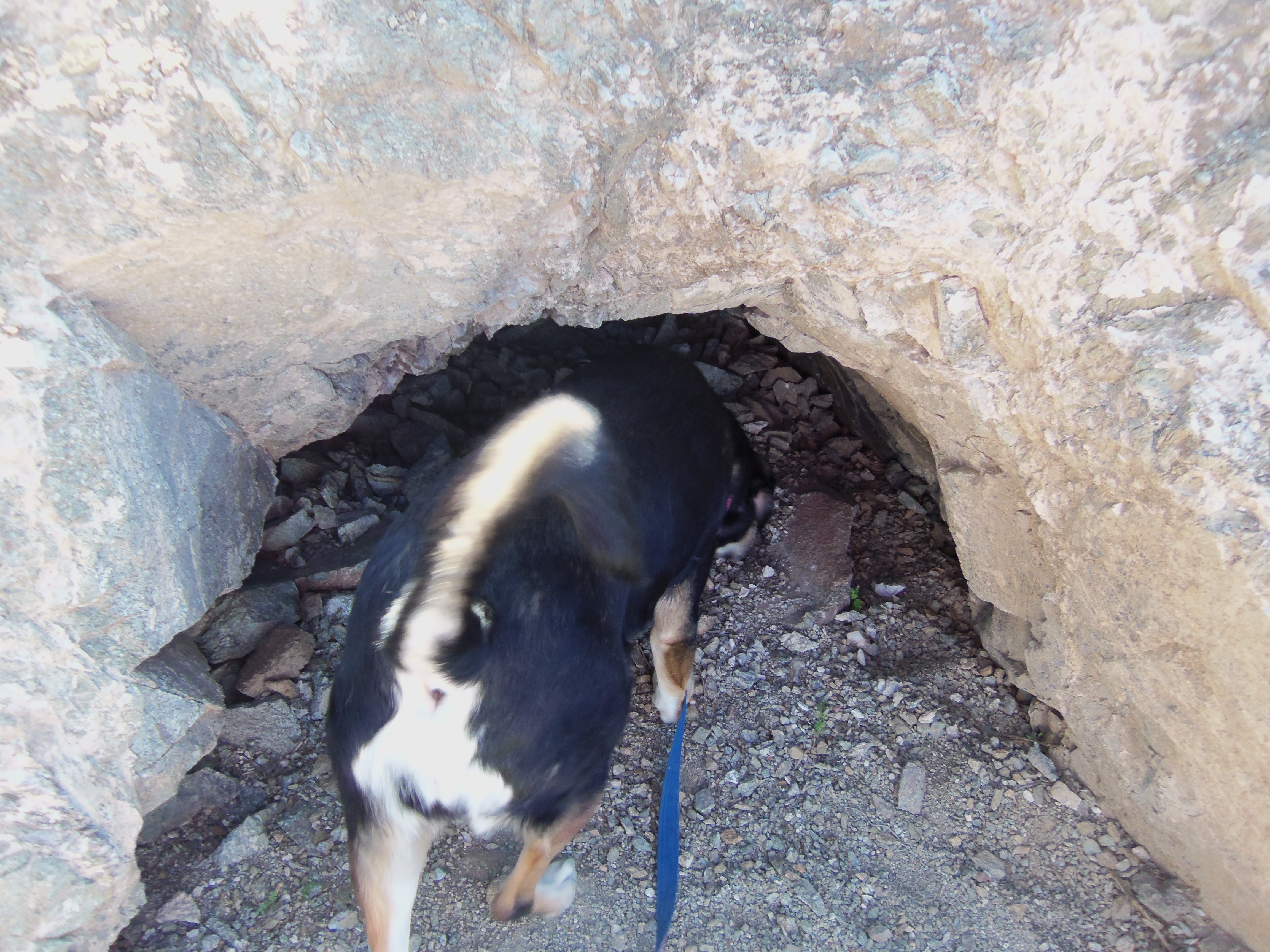 Choppy checking out a cave on the way down the mountain. This is as far as she got. Not pictured: Choppy running back out, evidently not happy with whatever she saw or smelled in there. I decided not to explore further.