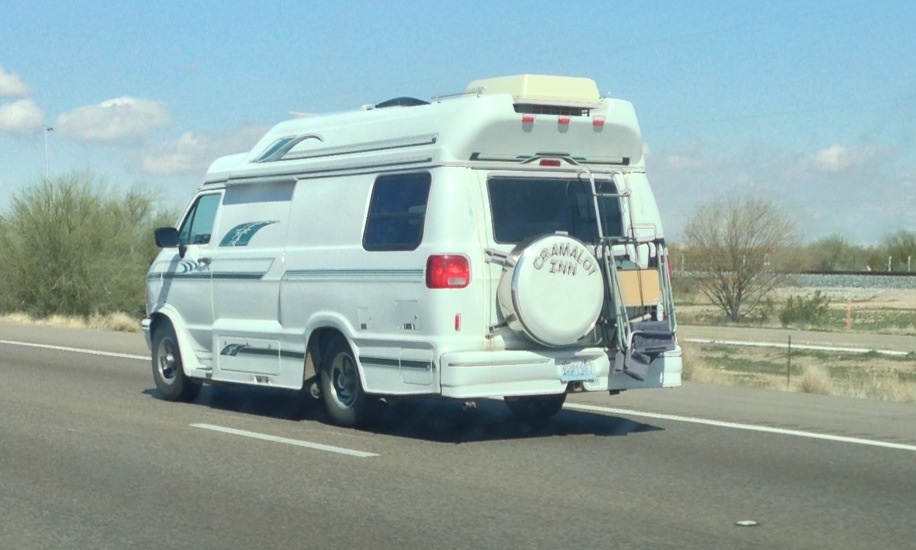 It’s kind of hard to see if you don’t enlarge the photo, but the name of the van camper is “Cramalot Inn.” This name could also be used for my own car while we are on the road. Relatedly, I really need to get a car top carrier before getting back on the road. I would like to use a mirror in the car again.