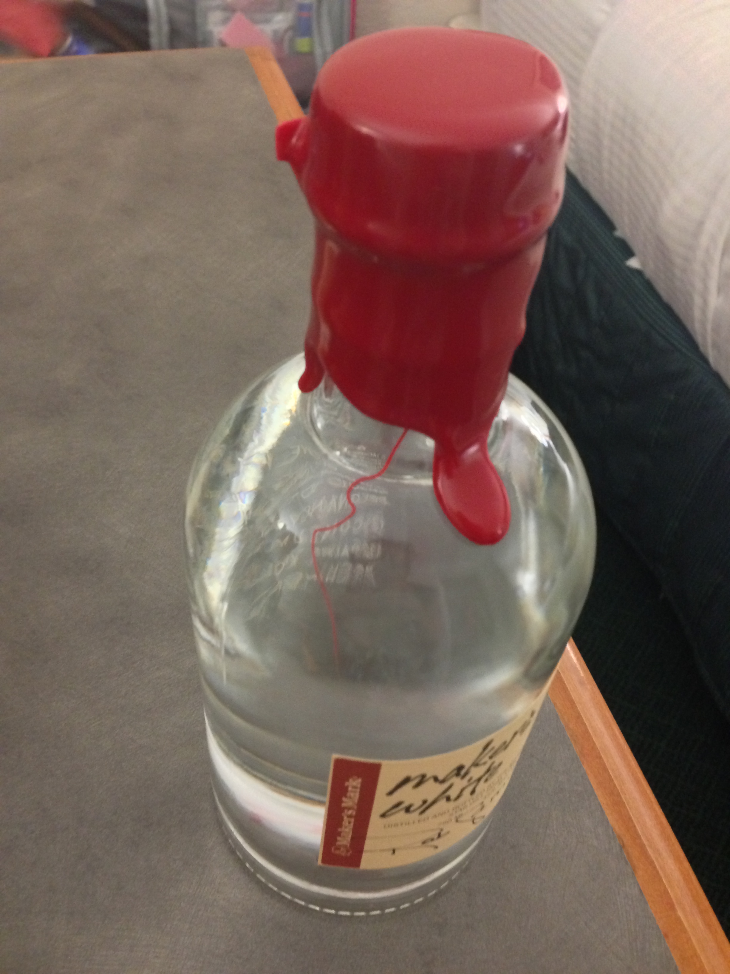 …but also because I am very, very bad at dipping bottles. As you can see from this bottle of white whiskey that I was dipping in the above-picture, with its random little wax tail. Also? I am pretty sure this is just legal moonshine.