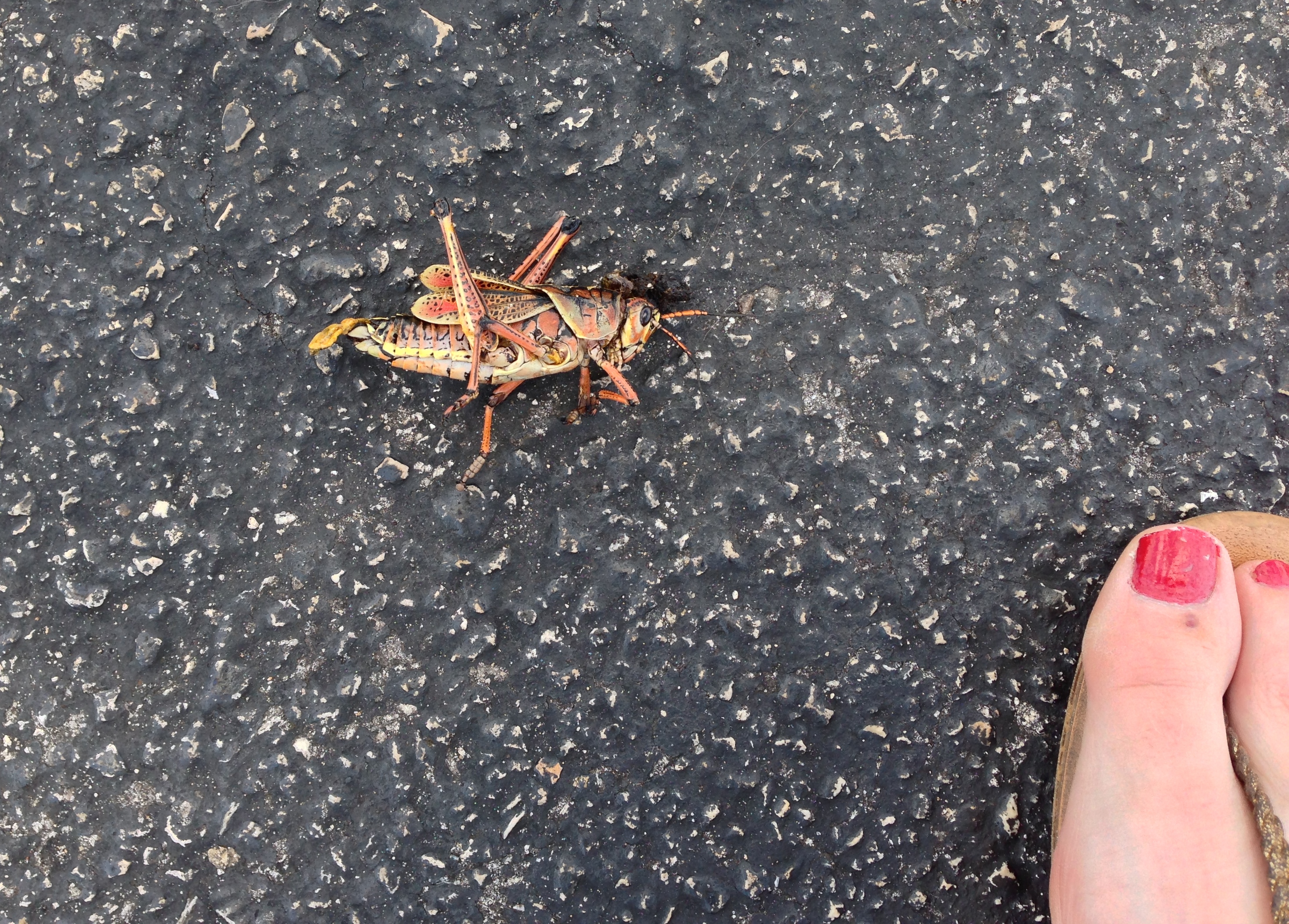 A dead giant grasshopper in the Welcome Center parking lot. He would be far more terrifying if there weren’t giant alligators a mere twenty feet away. And if the grasshopper was still alive.