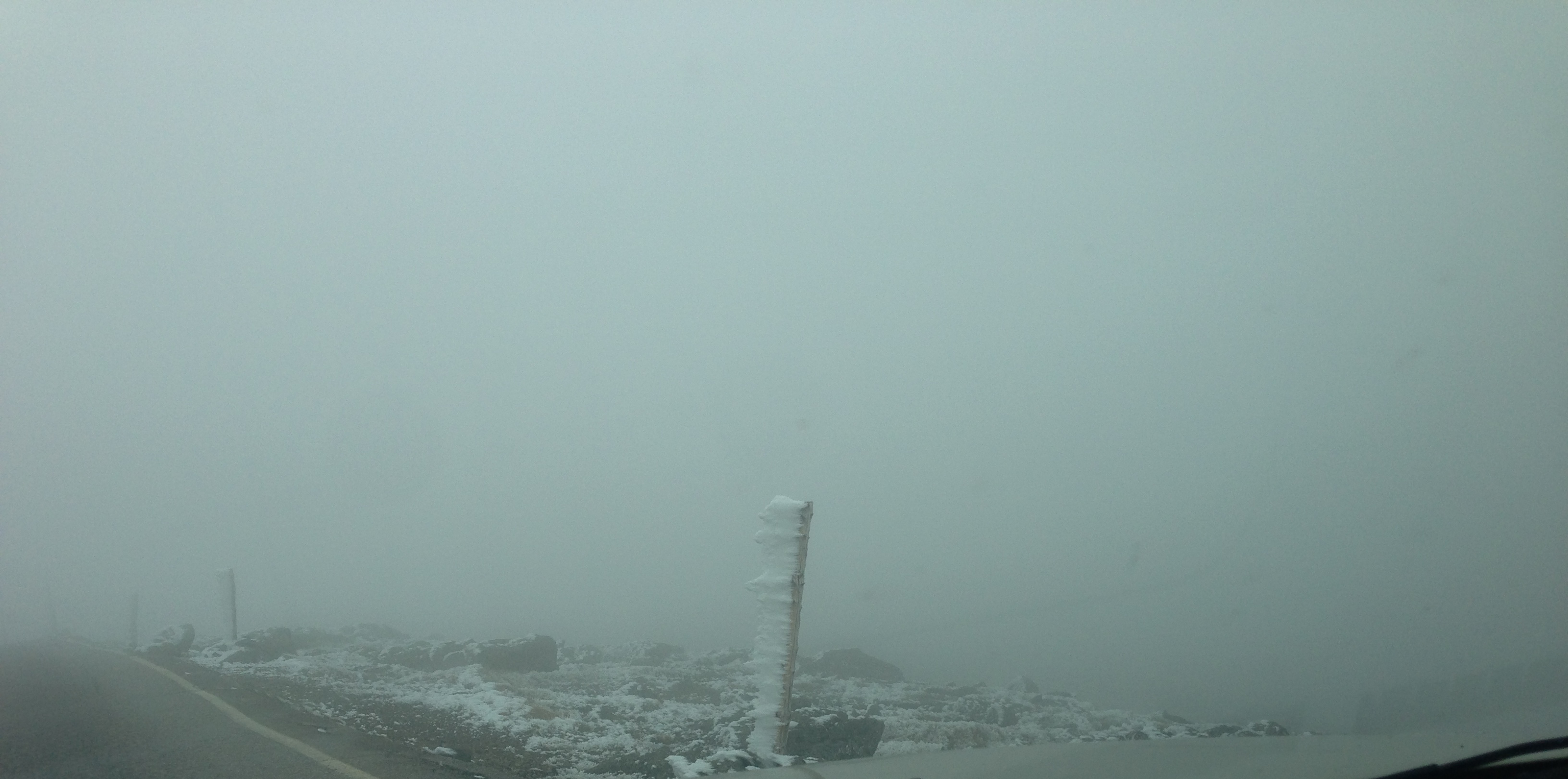 As we got progressively closer to the summit, the weather got progressively worse. As in, this was the visibility situation well before we reached the summit. After this, the road became grave, the visibility got worse, and I decided taking pictures while driving a road with sheer cliffs, icy conditions and a lack of a guardrail was the sort of poor idea that even I am unwilling to engage in.