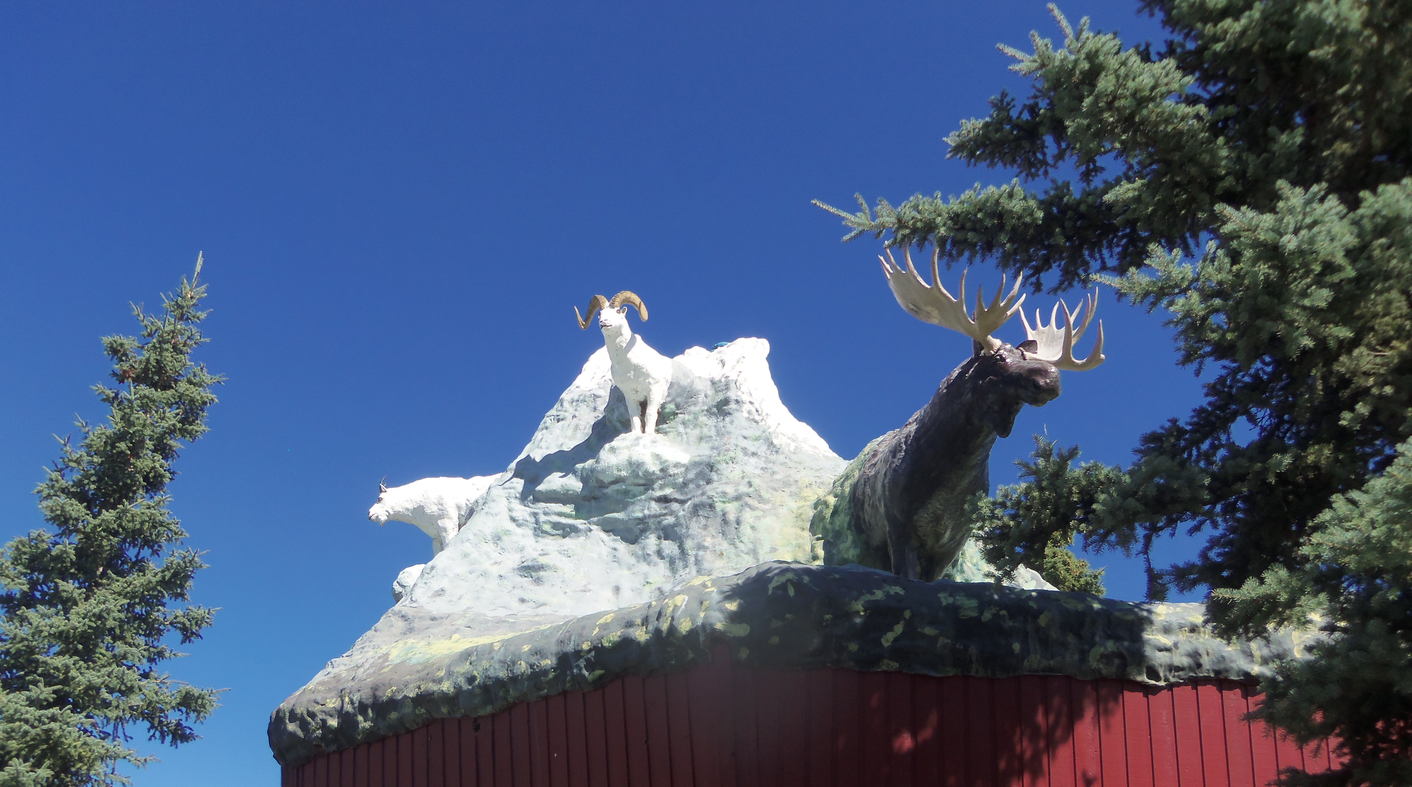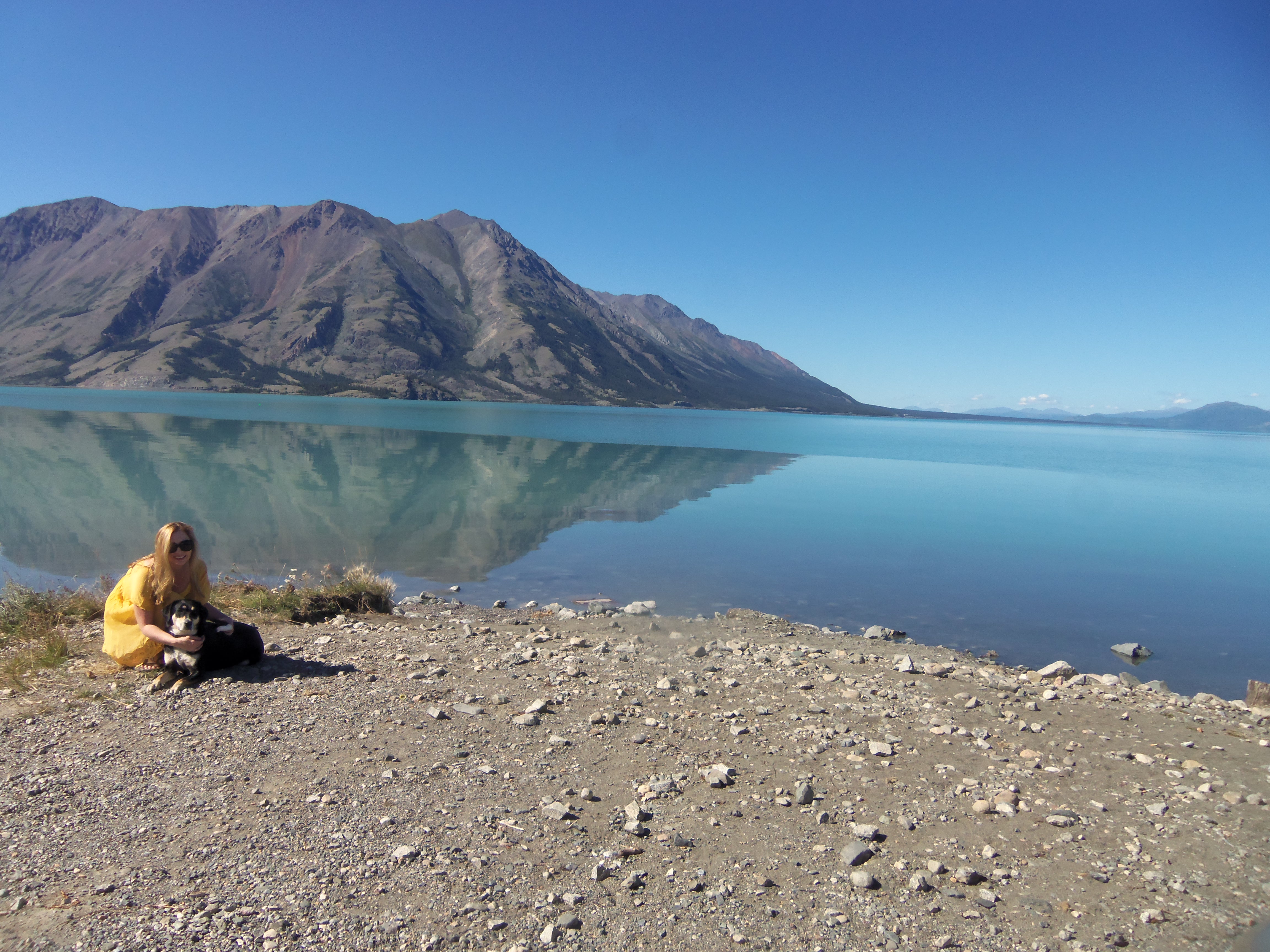 The sign reads “This historic building is being restored. Parts of the structure could be unstable. Please keep away from the building.” I’m pretty sure this is the point in the trip where we can all reassure ourselves that Choppy cannot read.This is one side of the statue at Haines Junction, where the Alaska Highway splits in two, with one road going toward Delta Junction, and the other to Haines (hence the name of the town). None of this has anything to do with this…interesting…statue at the junction. I am not sure why the artist failed to depict the back halves of any of the animals.This? This is Kluane Lake, the largest body of water contained entirely within the Yukon Territory. Note: the waves on Kluane are typically measured in feet, and therefore this view (without any waves) is not exactly typical. Sometimes, it is better to be lucky than to be good when it comes to photography.This? This is one of the many attempts I made to get Choppy involved in a picture by the calm waters of Kluane. As you can see, I failed. Taking pictures with a dog is an art, not a science.The frustration continued.And continued.Eventually I got a decent picture. Though as you can see, Choppy still needed a bit of prodding to get her head pointed in the correct direction.