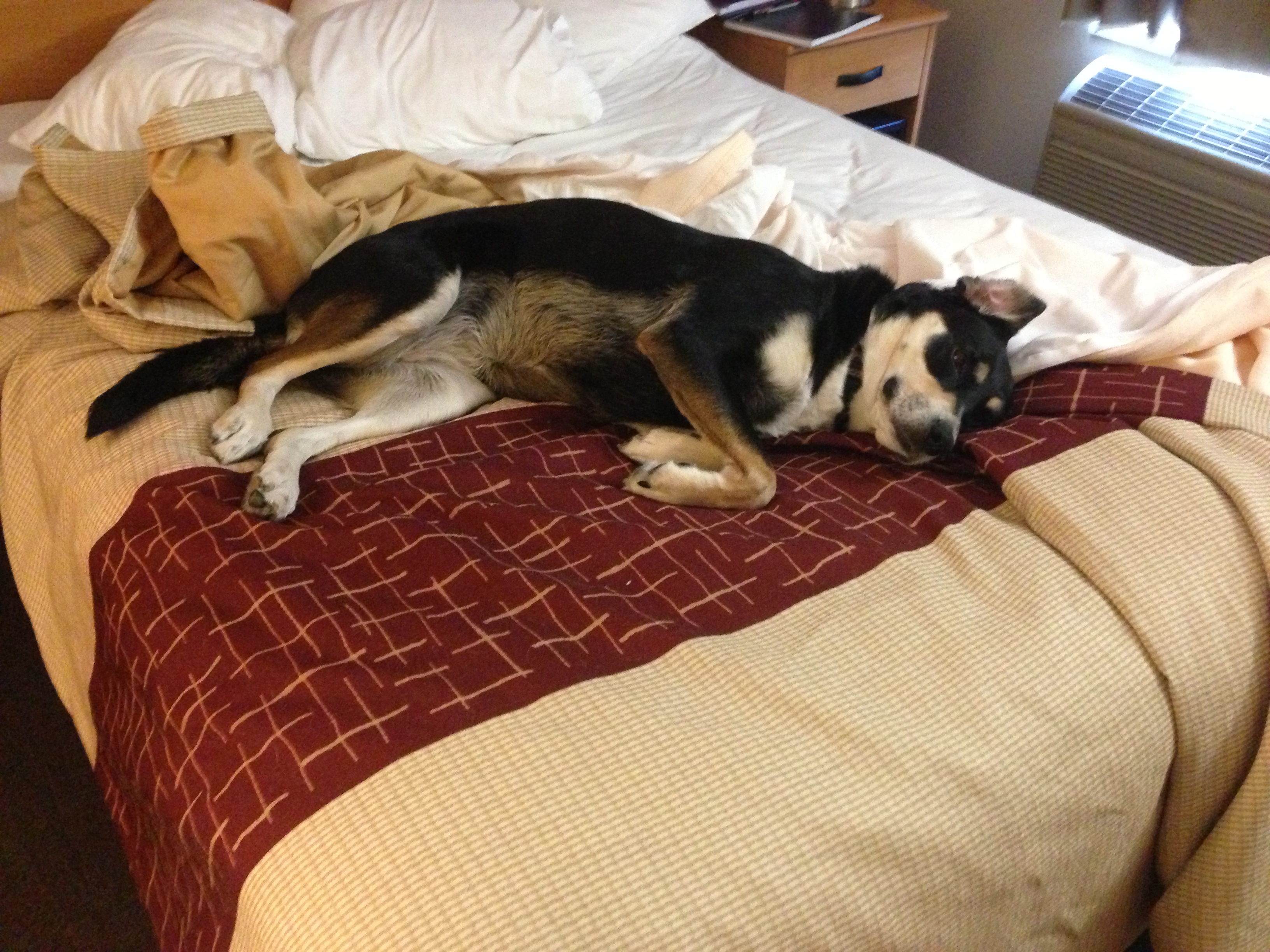 On the Road Oldie But Goodie – Post 3 Date: November 4, 2013Author: Sarah Ferguson and Choppy 1 Comment I’m pretty sure Choppy is thinking something along the lines of, “Oh, you wanted to sleep in this bed, too? Perhaps you should have thought of this earlier and gotten a hotel room with two beds.” Share this: Click to print (Opens in new window) Print Click to email a link to a friend (Opens in new window) Email Click to share on X (Opens in new window) X Click to share on Facebook (Opens in new window) Facebook Click to share on LinkedIn (Opens in new window) LinkedIn Click to share on Reddit (Opens in new window) Reddit Click to share on Tumblr (Opens in new window) Tumblr Click to share on Pinterest (Opens in new window) Pinterest More Click to share on Pocket (Opens in new window) Pocket Click to share on Telegram (Opens in new window) Telegram Click to share on WhatsApp (Opens in new window) WhatsApp Like Loading...