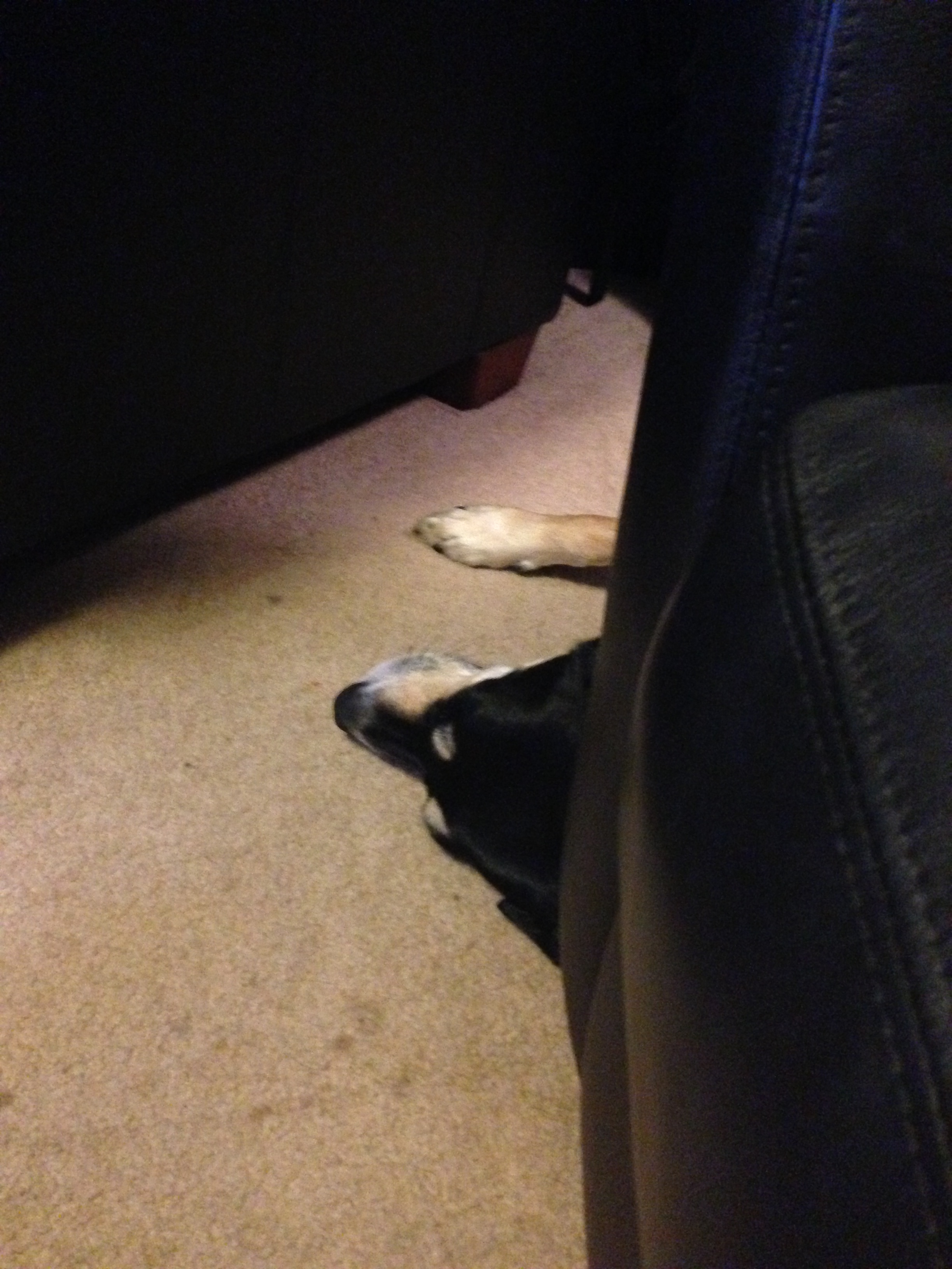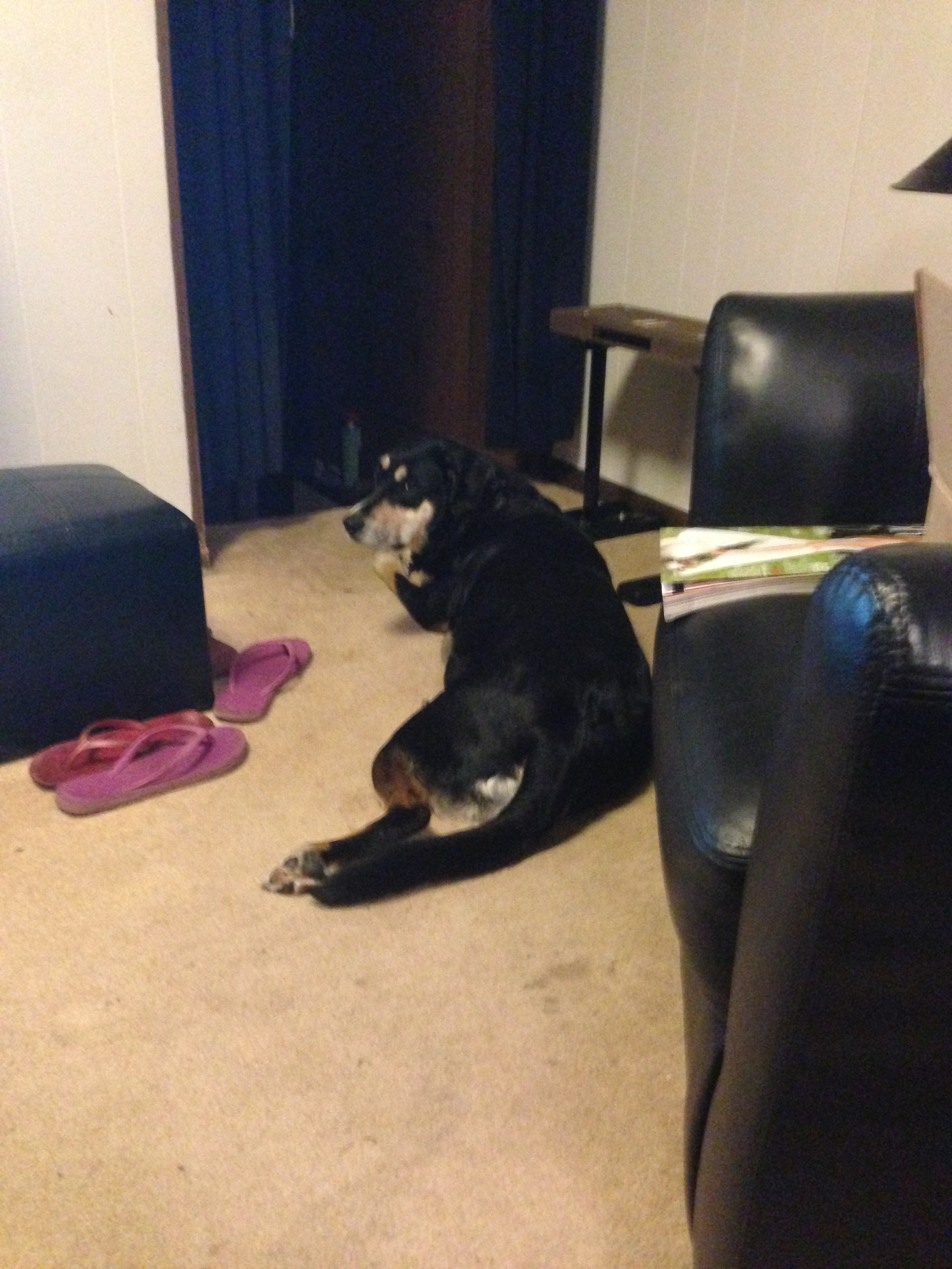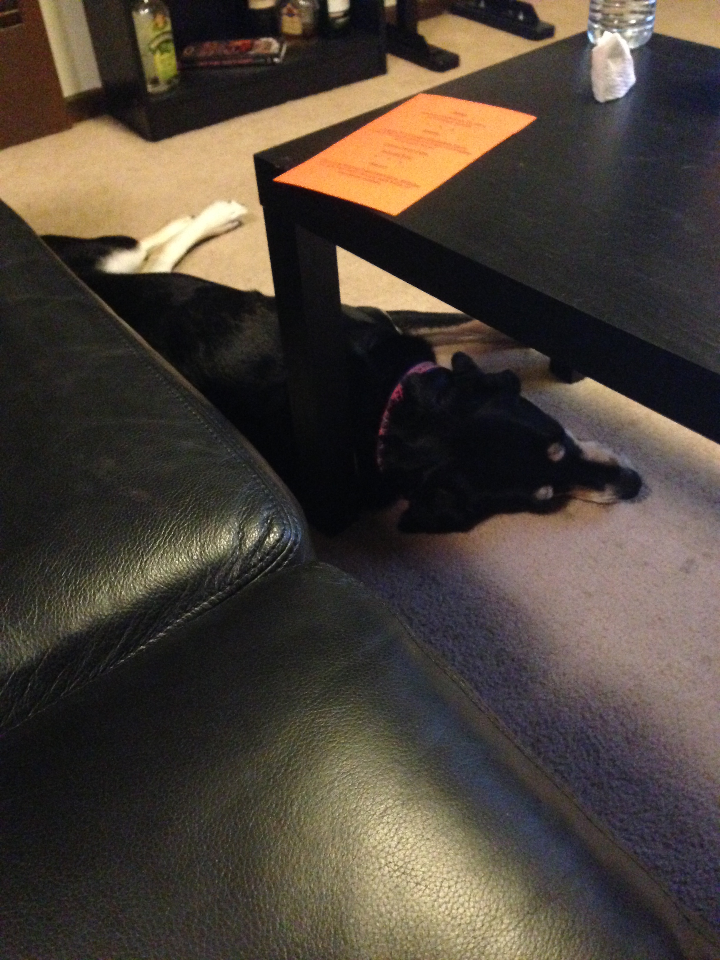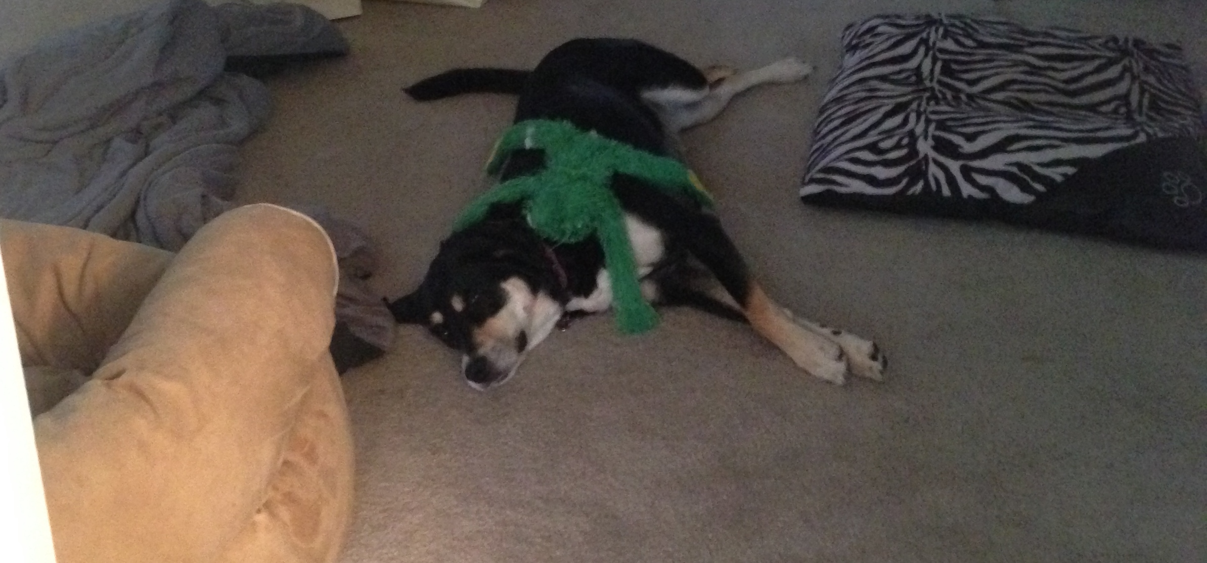 This is Choppy begging for food. Yes, she begs. I have no idea who could be giving her food from the table and would cause this behavior…This is Choppy exhausted after a long day of napping and begging for food. It’s a tough life.Number of times Choppy goes outside? No idea. But this is where she sits when she wants to do so. She sits here a lot. A whole lot.Another picture of Choppy asleep. I have no idea why I think anyone wants to see a picture of her taking a nap, but based on the number of those pictures here, I seem to think everyone wants to see this sort of picture.Paul put this toy on Choppy. It takes a lot more than that to annoy her (after all, she has been putting up with my desire to dress her up for years).