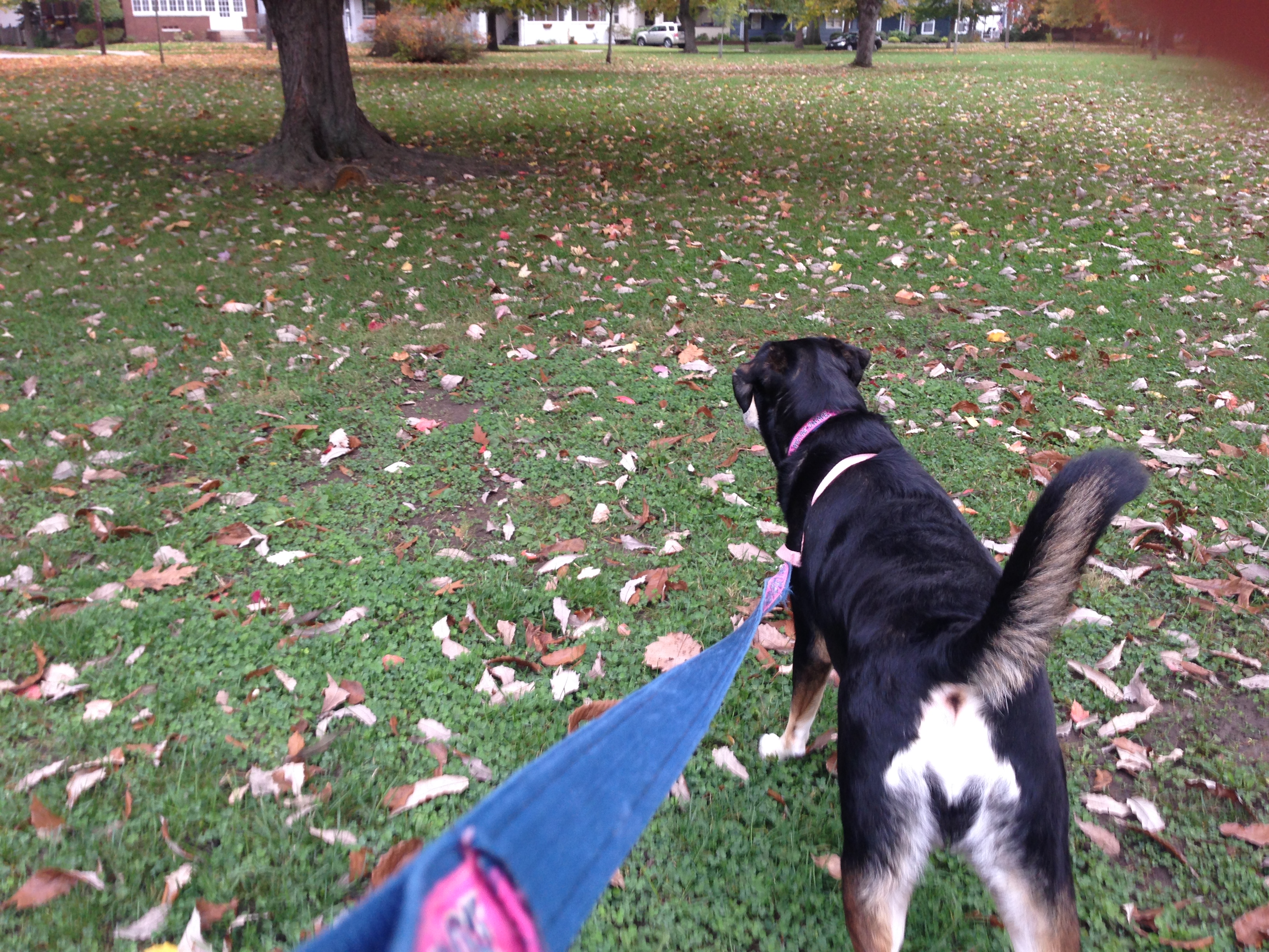 Choppy demonstrating her favorite way to sit – the lazy sit!The squirrels have started to go crazy in the park preparing for winter. This has not made our walks more pleasant for me.On the other hand, Choppy is loving the squirrel craziness.Paul suggested this picture looked like an album cover. In related news, should any band wish to use this for their next album cover, please feel free to contact me to work out a deal.This is (obviously) not Choppy. This is Sonny. He may find me to be awesome because I fed him some pumpkin cookies. Or because I’m awesome. I’ll go with the latter.