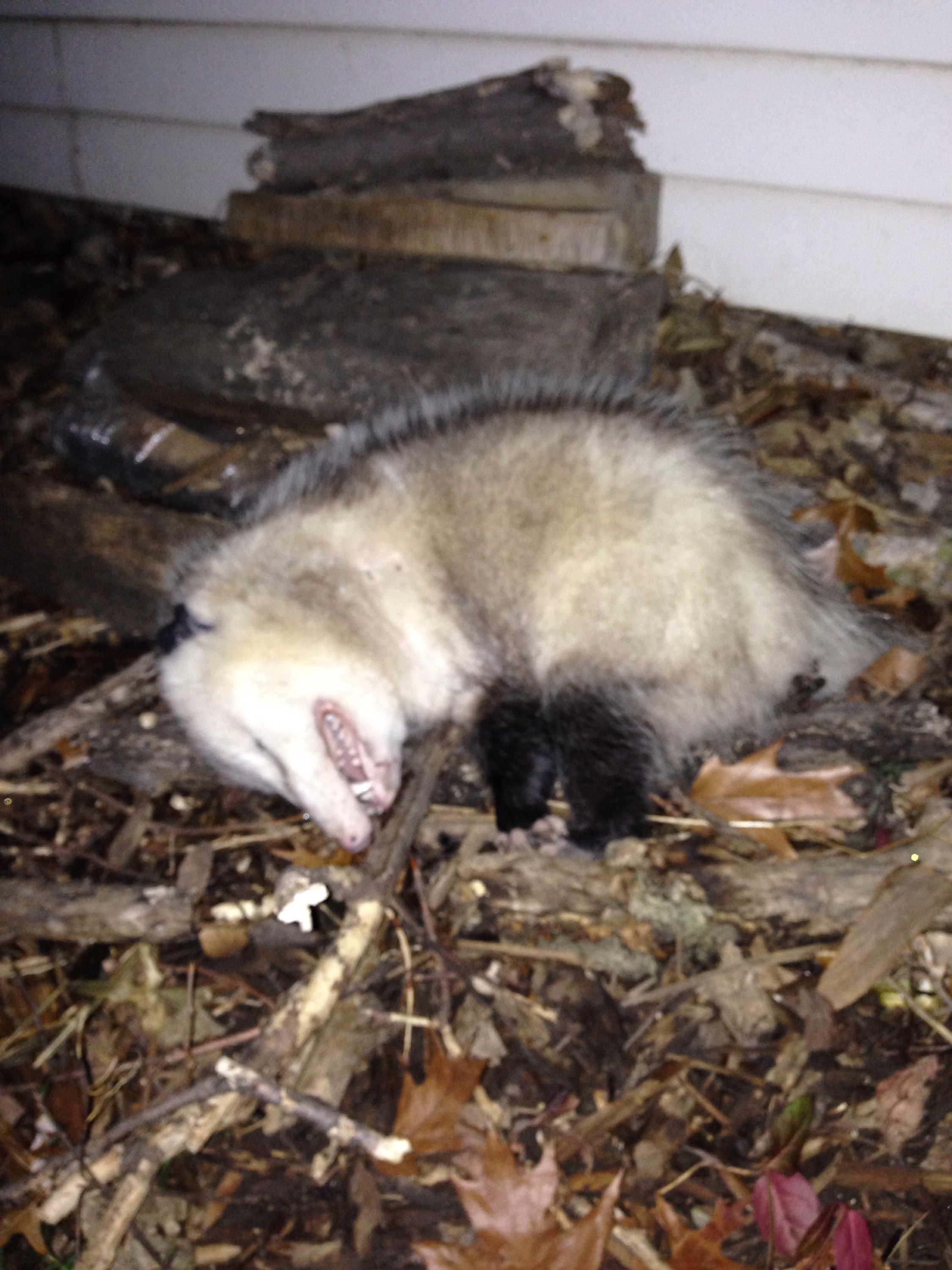 [Note: I realized after this posted that I should let everyone know the possum isn’t dead – it’s just playing possum. He was definitely gone by the next time Choppy went outside].