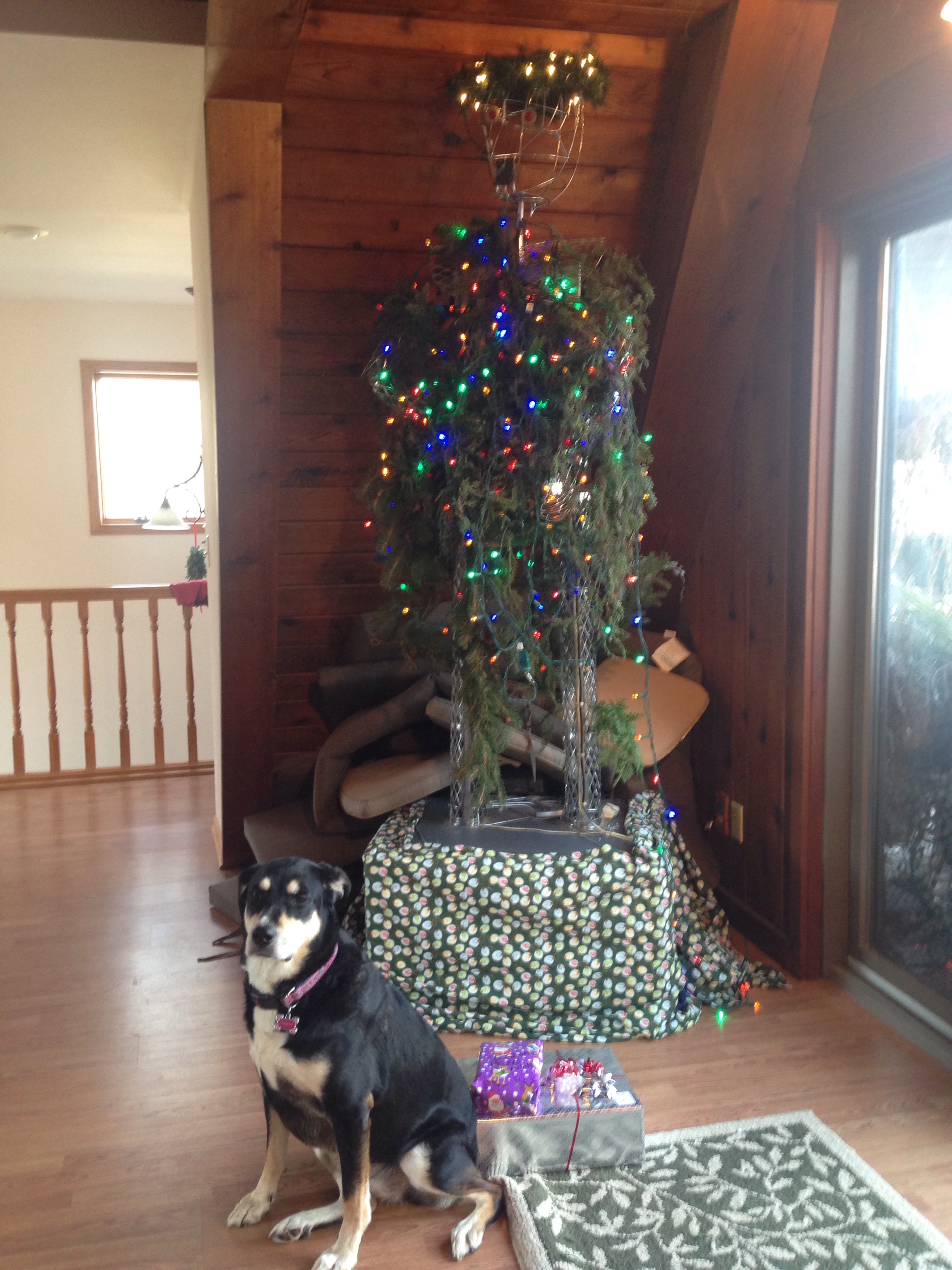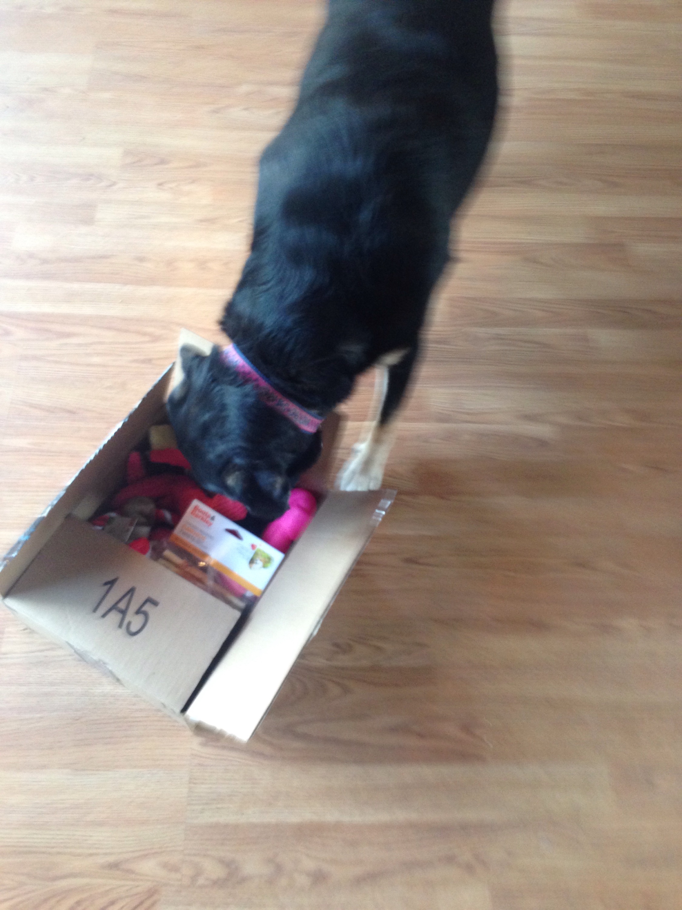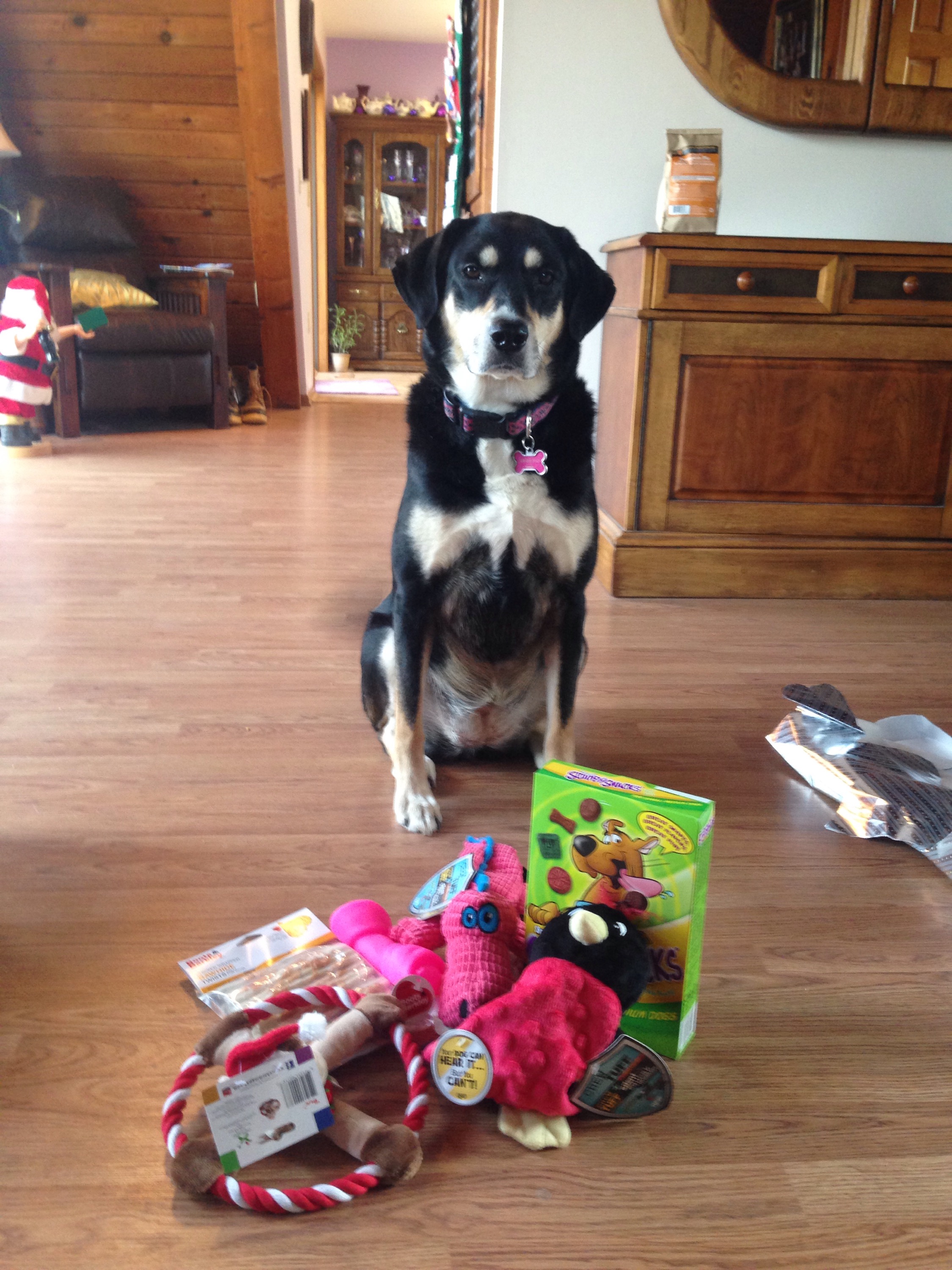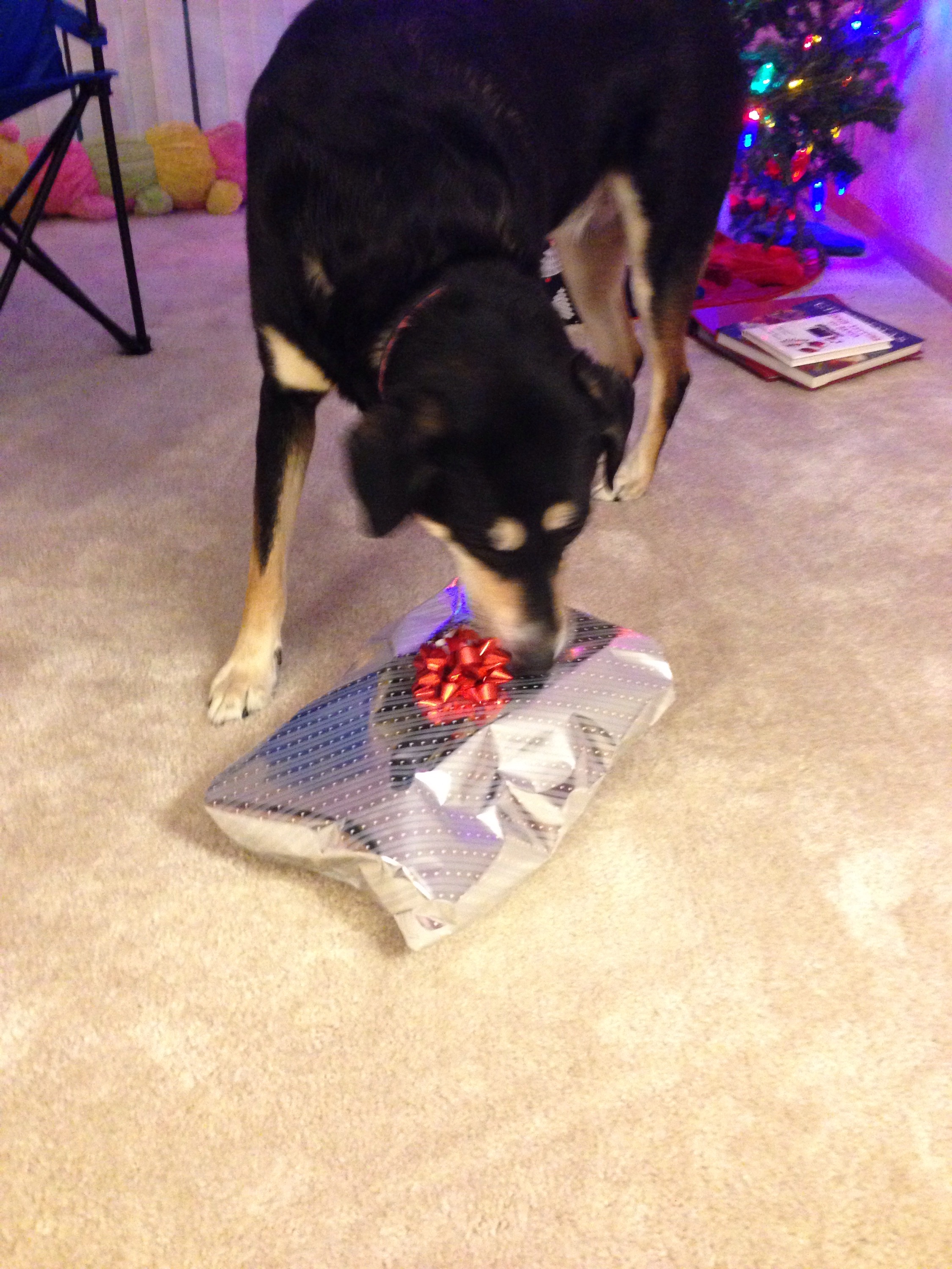 This is Choppy with my parents’ robot. Oh, and presents.I’m pretty sure Choppy knew exactly what was in here long before she opened it. She still acted surprised. Or maybe it was just happiness at finally getting to eat some of the treats she had been smelling for weeks.Well, treats she got to eat after being forced to sit for yet another picture.A gift from Paul! (Choppy hopes it is a vacation from him – just kidding. Sort of).It’s a toy and treats! Not quite vacation, but she wasn’t going to pass either up.