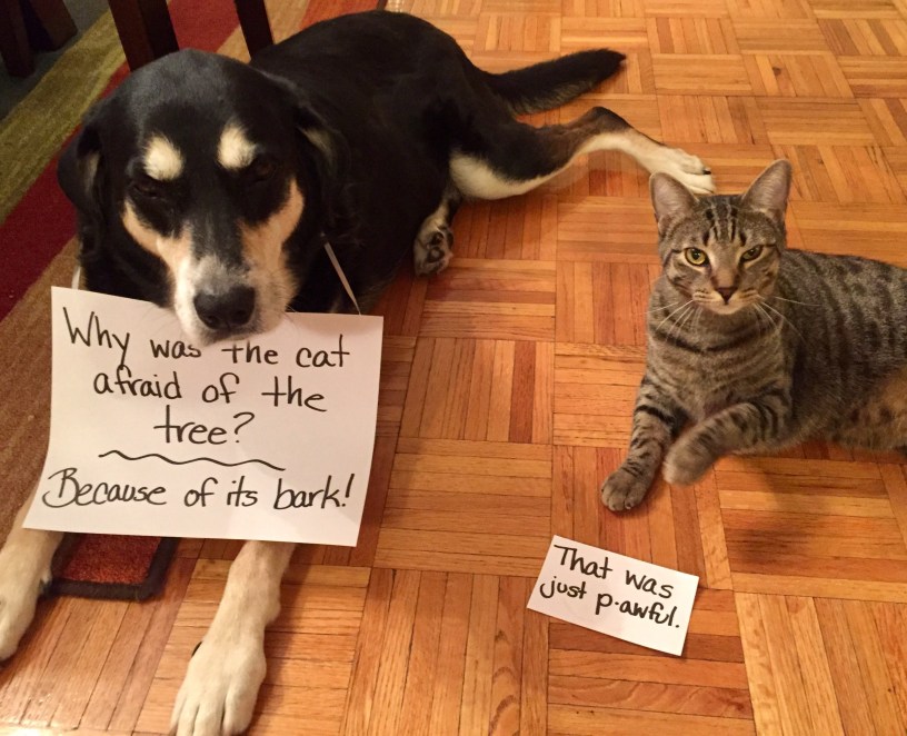 Aaaaaw, Schooner raised his paw! Has he been up to beat Schooner for that joke? 😉