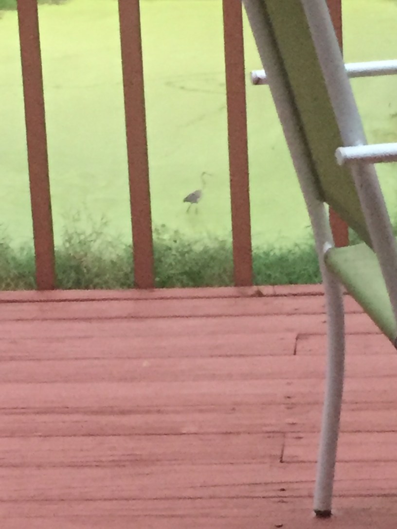 The other night, a heron made a stop at our pond (yes, there is pond under all that murk…I think). I couldn’t get a closer shot; they tend to be nervous and I was surprised I got this close without him flying off.
