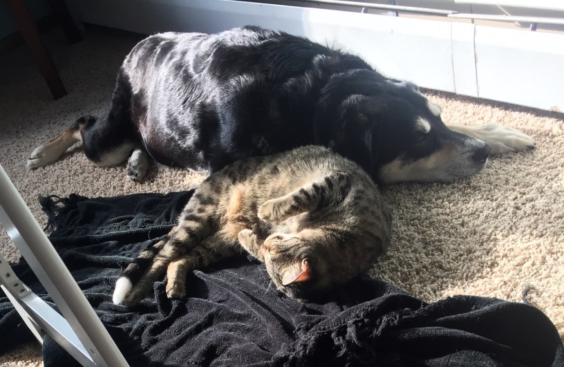 My cat, Harper, loves my dog, Chase. He will snuggle with him, any chance he gets. Chase, on the other hand is a people person. He will put up with the cat, but I think he would rather be somewhere else – just like Choppy.