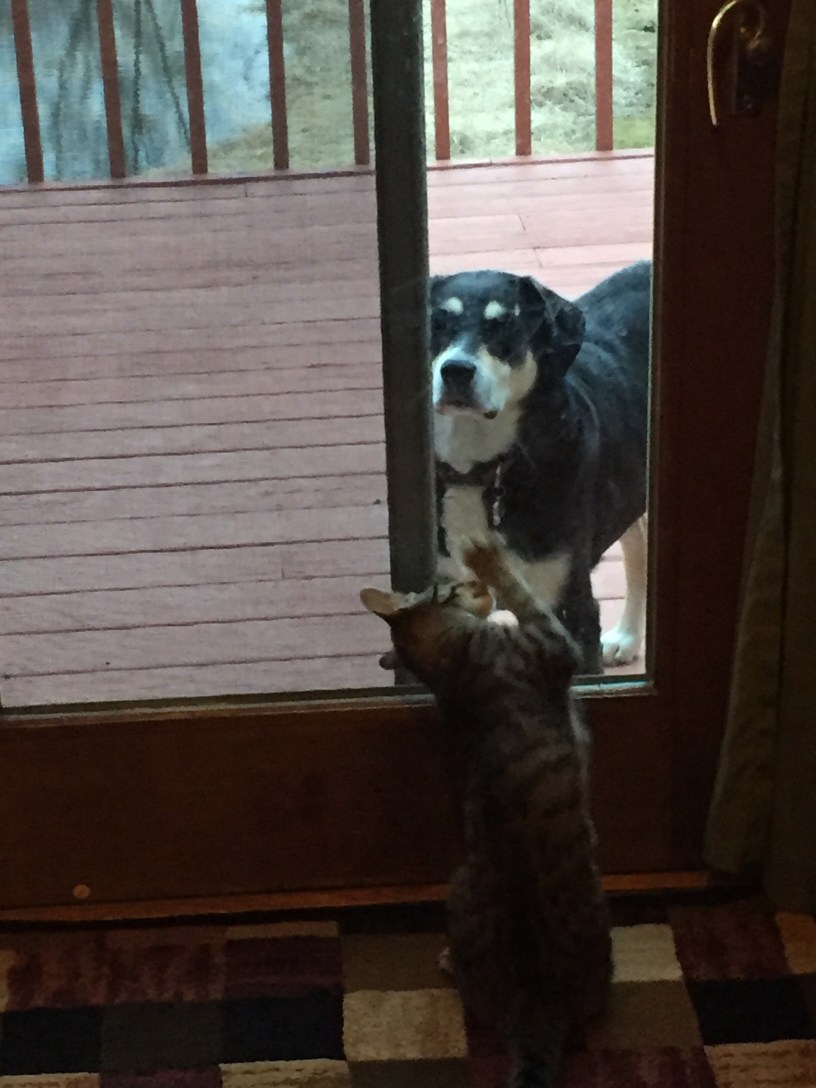 This is not an uncommon scene around here – Schooner wants out, and Choppy wants in (only the latter actually happens, though Schooner is still hopeful one day he will get to play outside).