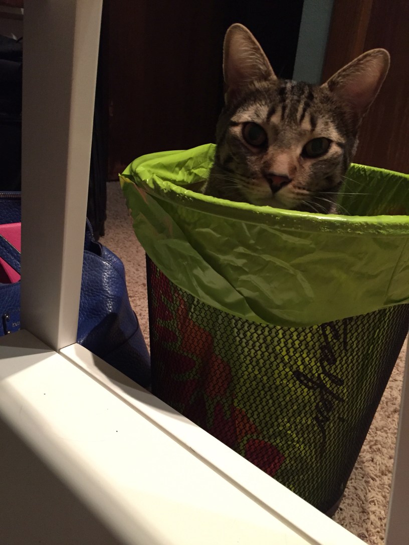 I’ve posted pictures of Schooner in the garbage before, but really. Can you ever have enough pictures of a cat sitting in a trash bin?