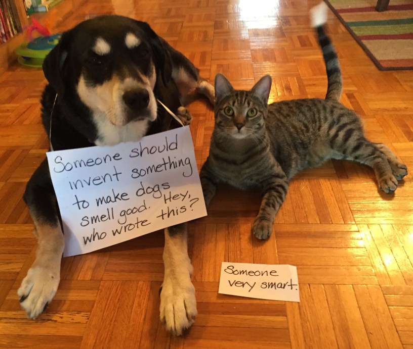 Choppy does have the perfect look…shock, indignant, and not very happy. I wish that invention had been available today. Tippy got into something during our walk. I thought it was just her feet, so washed them. But, when I walked by, whew!!! I smelled her feet and they were okay. So, I had to do the sniff test to see where she was stinky. LOL I finally found it. The neck area – scooting in the smelly stuff seems to be just as much fun as rolling in it. So, after washing number 3, she smell good enough to come indoors, but I could really use some doggy smell-be-gone.