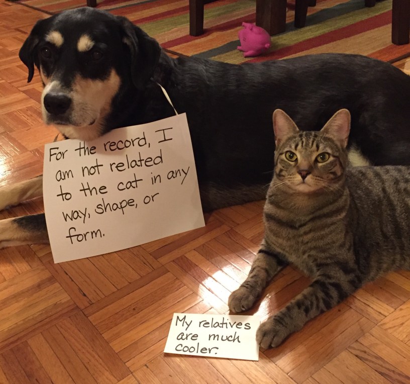 ……well…..kind of related…both mammals, both long tails, 4 legs, ears, both ❤️ bacon, both adopted, both loved….both enjoy ‘kind of’ snuggling on occassion.