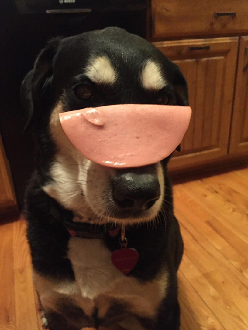 Things Choppy did not like about this photo shoot: balancing bologna on her nose.