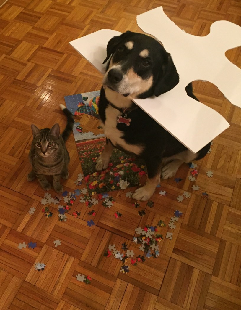 That is a puzzle. Poor Choppy doesn’t look very happy being a puzzle piece. My mom and dad love doing jigsaw puzzles. They have to put cardboard over it when they aren’t actively working on it so that their cat doesn’t tear it all to pieces again. Yes, they learned that lesson the hard way. LOL