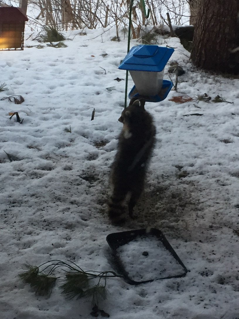 Now that the snow is melting and it is warming up, we’re getting more wildlife. Apparently, said wildlife doesn’t realize these are bird feeders, not raccoon feeders.