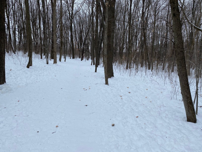 We spend a lot of time at the dog park these days – Flapjack loves it. It’s over 100 acres, but most of it is pretty open. It turns out, a mostly-black dog is easy to find in the snow, so it’s tough to get a photo of him that works for this post out there. Now, add some trees, and it’s much more difficult. Thankfully, there is a path through the small wooded portion of the park, so I’ve snapped some pictures in there for this.