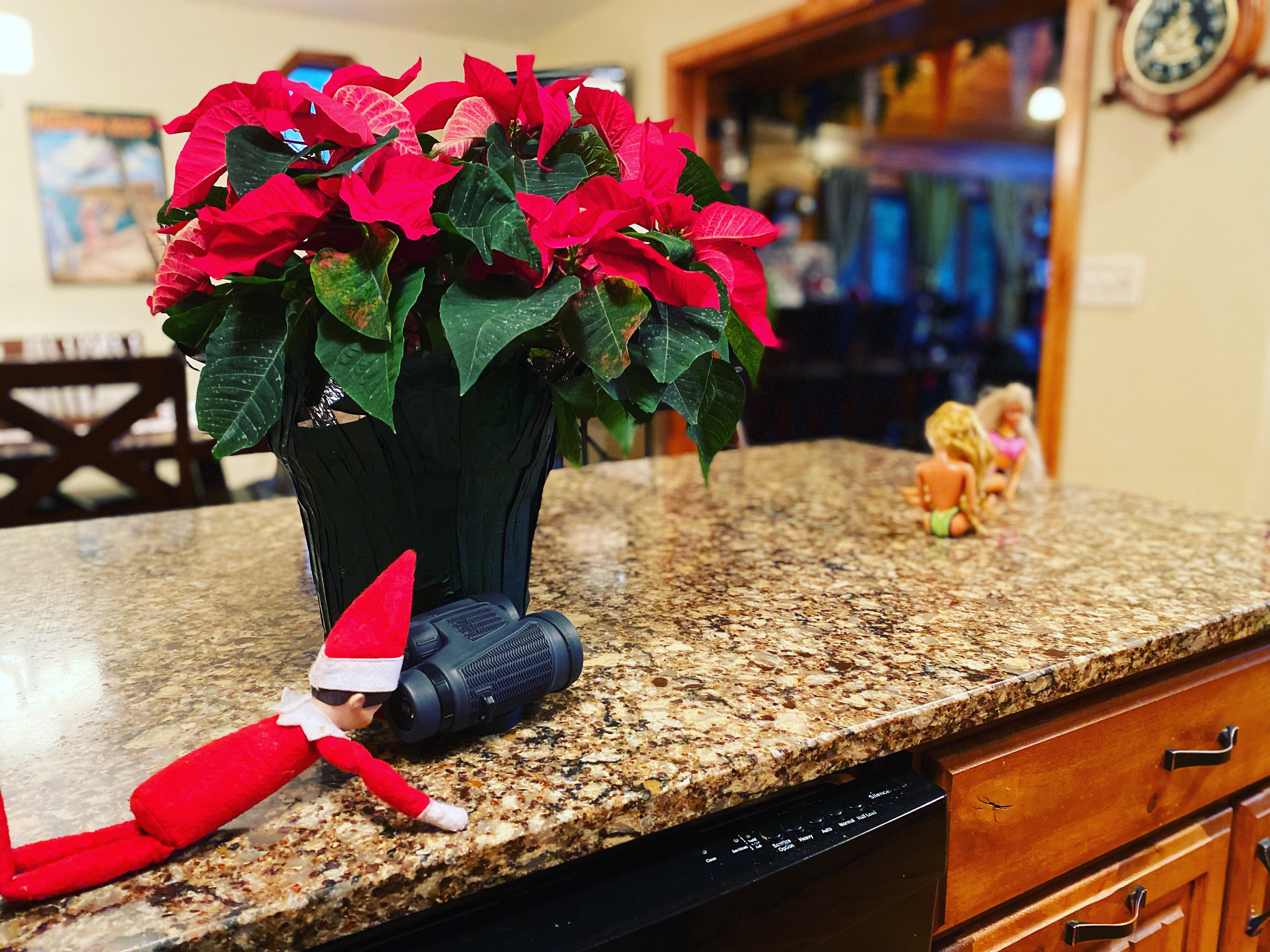 Elfie’s back!! Maybe he could some sunscreen on those Barbies.